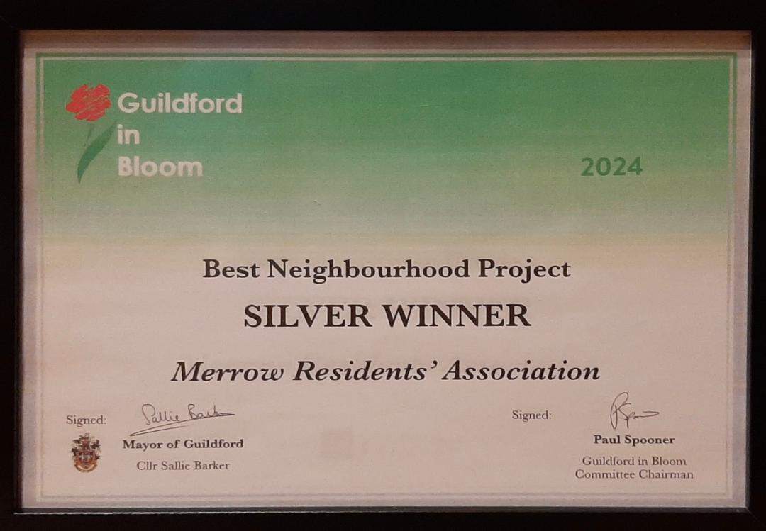 The Merrow Residents’ Association (MRA) has been in existence for over 50 years and provides a focus for Merrow (a village near Guildford in Surrey) on the community, environmental, planning, historical and local issues and has a membership of about 500 people.